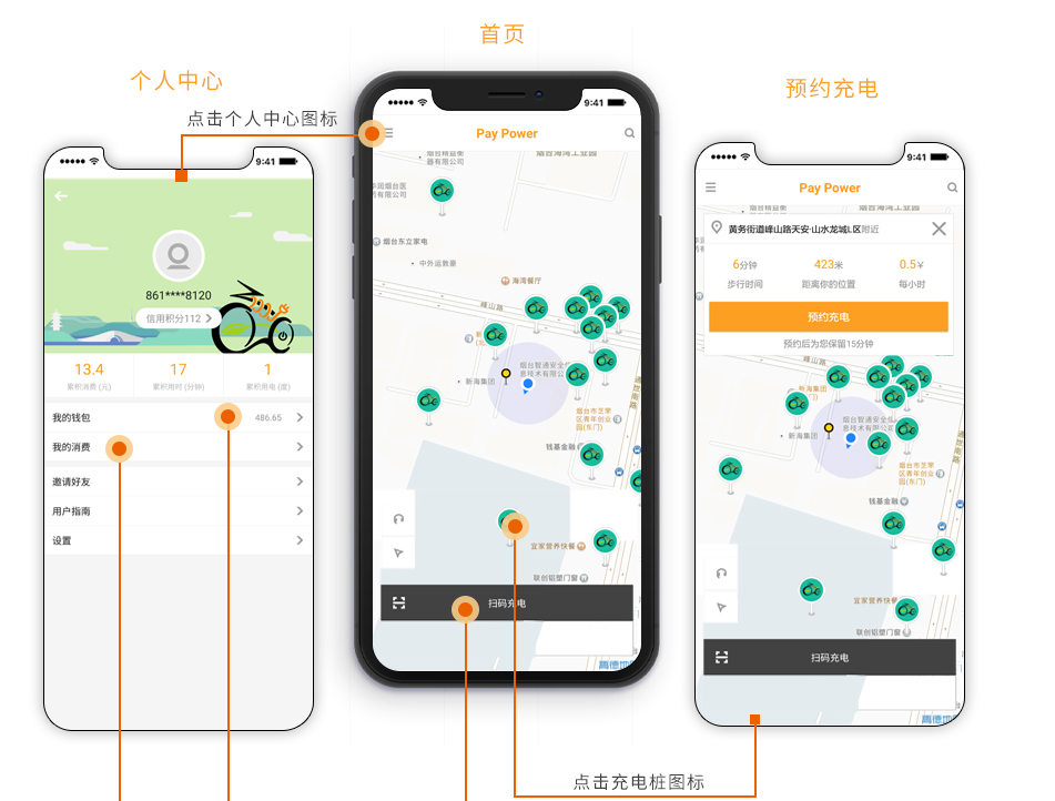 共享充電樁APP隨時隨地充電,在線支付,充電花費一目了然,方便快捷。